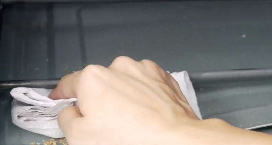 - Loại bỏ các mảnh vụn thức ăn ở dưới đáy lò nướng: Sử dụng miếng bọt biển, khăn giấy hoặc khăn lau để chà sạch những mảnh vụn thức ăn và dầu mỡ dưới đáy lò.