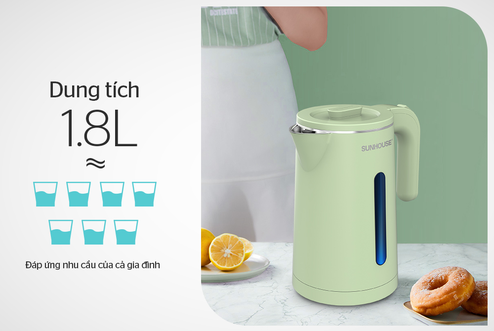 Nổi bật với thiết kế hiện đại, tinh tế, màu sắc trang nhã, ấm siêu tốc inox 2 lớp 1.8L SUNHOUSE SHD1353 là sự lựa chọn phù hợp cho những căn bếp hiện đại. Ấm có dung tích lớn 1.8 lít cùng công suất hoạt động cao (1500W) giúp việc đun nước nhanh chóng hơn, tiết kiệm thời gian và điện năng tối đa. Không chỉ là một thiết bị nhà bếp, ấm siêu tốc SUNHOUSE SHD1353 còn là một vật trang trí tinh tế cho căn bếp, thể hiện mắt thẩm mỹ của chủ nhà.