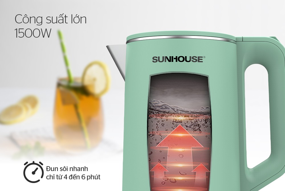 Nổi bật với thiết kế hiện đại, tinh tế, màu sắc trang nhã, ấm siêu tốc inox 2 lớp 1.7L SUNHOUSE SHD1350 là sự lựa chọn phù hợp cho những căn bếp hiện đại. Ấm có dung tích 1.7 lít cùng công suất hoạt động cao (1500W) giúp việc đun nước nhanh chóng hơn, tiết kiệm thời gian và điện năng tối đa, phù hợp cho cả gia đình hay những anh chàng cô nàng độc thân. Không chỉ là một thiết bị nhà bếp, ấm siêu tốc SUNHOUSE SHD1350 còn là một vật trang trí tinh tế cho căn bếp, thể hiện mắt thẩm mỹ của chủ nhà.