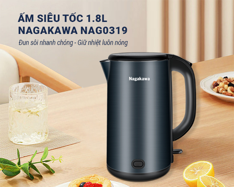 Ấm siêu tốc 1.8L Nagakawa NAG0319 có công suất là 1800w. Công suất cực đại này giúp nước sôi nhanh chóng, rút ngắn thời gian đun nấu. Phục vụ kịp thời trong trường hợp pha sữa cho bé, nhà có khách, nấu ăn,...
