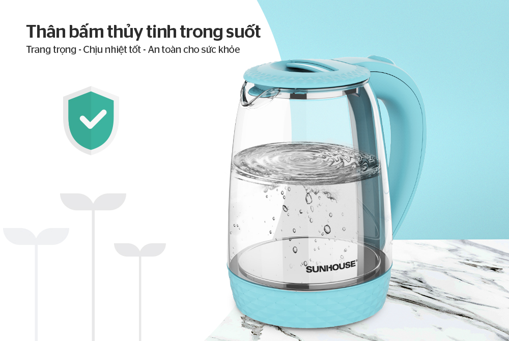 Ấm siêu tốc 1.8 L SUNHOUSE SHD1215 có kiểu dáng đẹp, sang trọng. Thân ấm bằng thủy tinh chịu nhiệt trong suốt, hoa văn bắt mắt, tính thẩm mỹ cao, không bị oxi hóa nên rất an toàn cho sức khỏe và tiện lợi khi vệ sinh.
