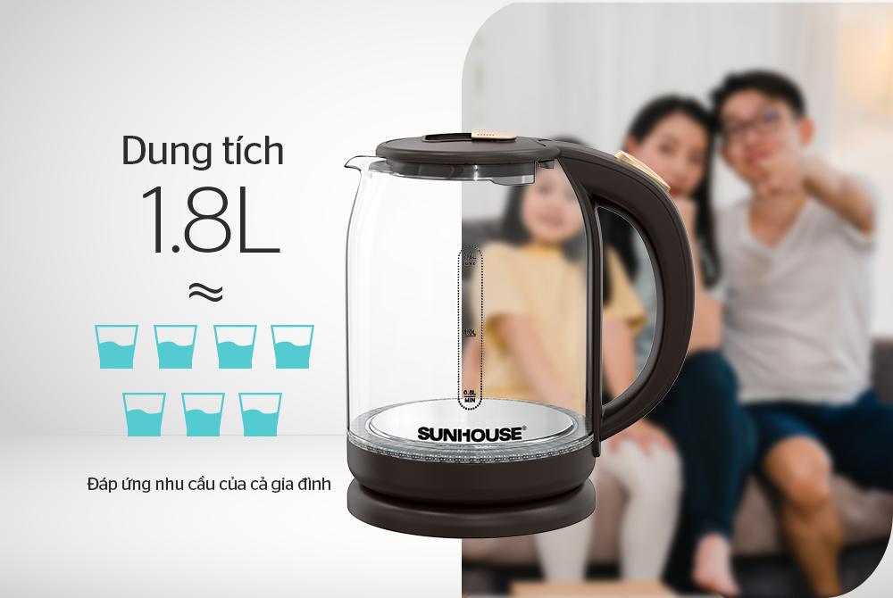 Với dung tích lớn 1.8L, ấm siêu tốc Sunhouse SHD1212 có thể đáp ứng nhu cầu sử dụng nước nóng cho gia đình. Bạn có thể thoải mái đun nước pha trà, cà phê, nấu mì gói, nấu cháo cho bé mà không cần lo lắng về việc phải đun nhiều lần.