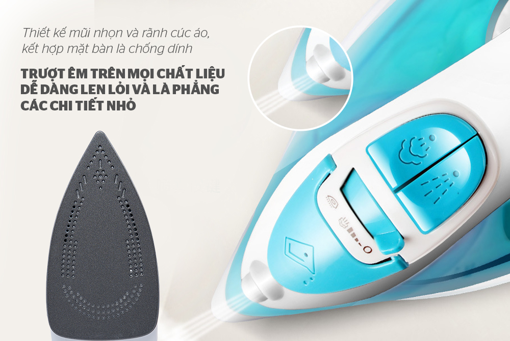Ngoài ra, mũi bàn là nhọn giúp len lỏi tốt vào các vùng ủi hẹp như cổ áo, hai hàng cúc, nách áo…