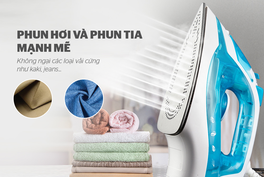 Bàn là có 2 chức năng phun hơi và phun nước, là phẳng cả những loại vải dày và những nếp nhăn cứng đầu nhất.