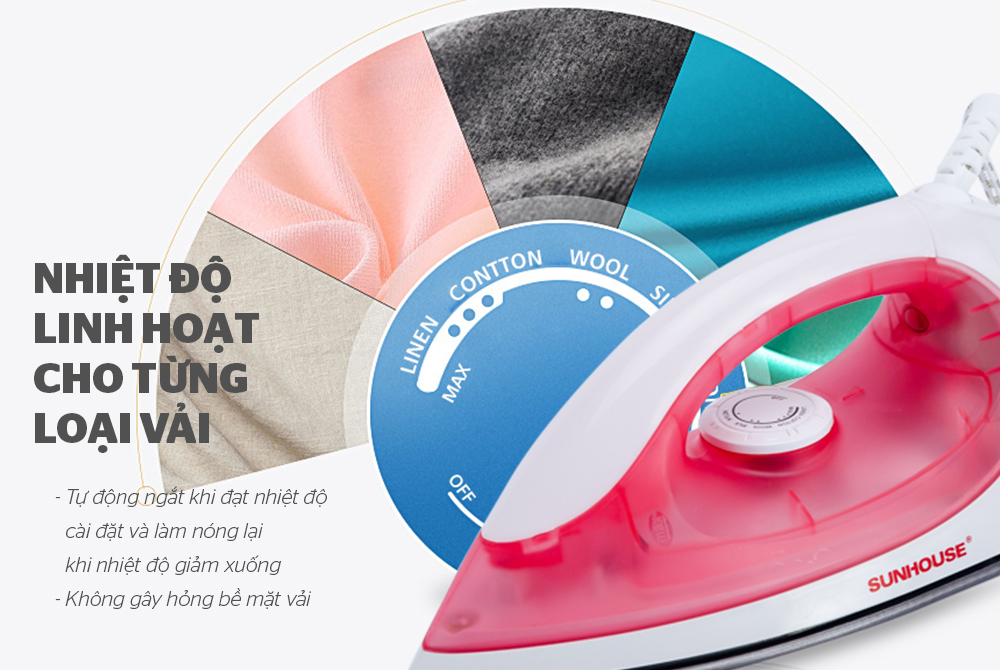 An tâm hoàn toàn khi sử dụng bàn là khô SUNHOUSE SHD1072 vì được trang bị cảm biến nhiệt an toàn, tự động đóng ngắt khi quá tải nhiệt. Bàn là sẽ tự ngắt khi đạt đến nhiệt độ lý tưởng (phù hợp với các loại vải khác nhau).