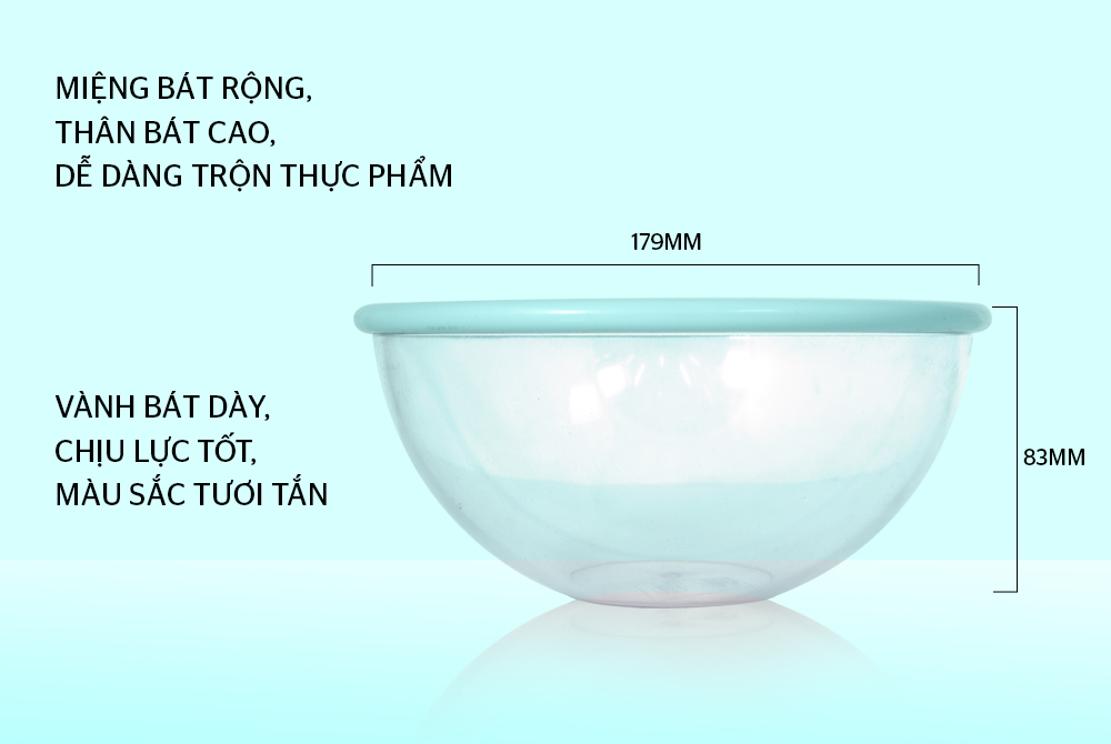 - Thiết kế miệng bát rộng, thân bát cao, dễ dàng trộn nhiều loại thực phẩm