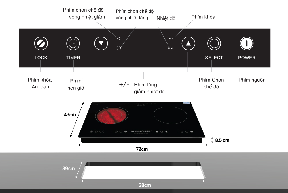 SUNHOUSE SHB9106-ES được trang bị nhiều tính năng hiện đại như hẹn giờ, khóa trẻ em và tự động ngắt khi quá tải giúp đảm bảo an toàn cho người sử dụng và nâng cao độ bền cho bếp.