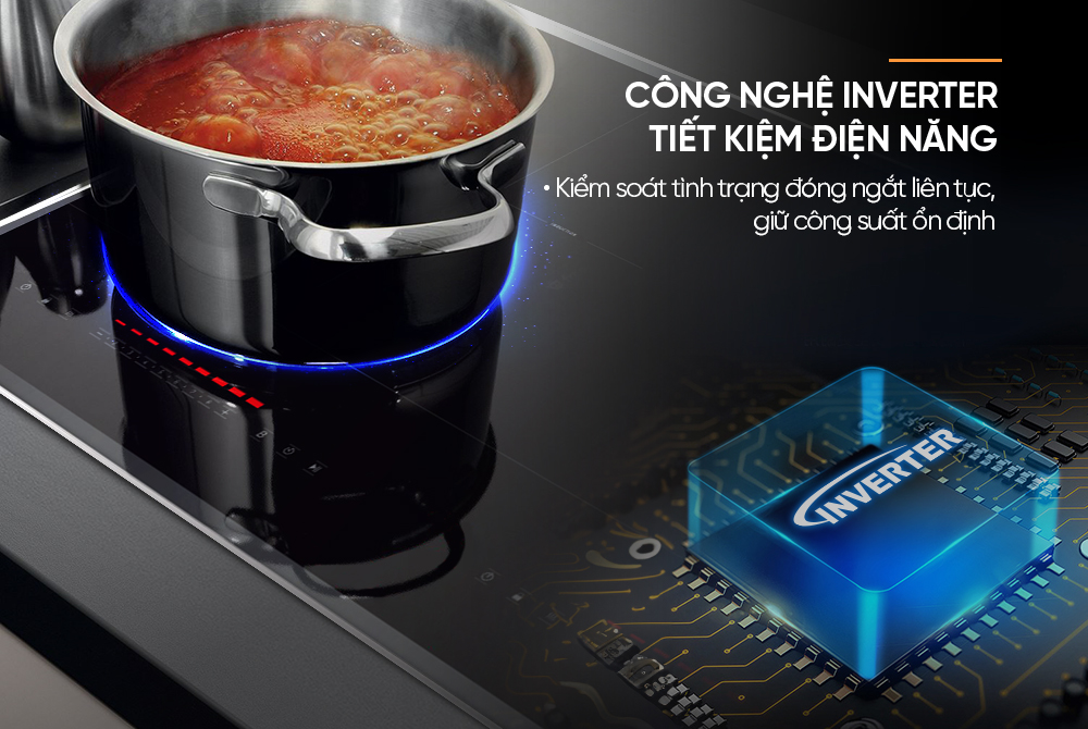 Không chỉ mang lại hiệu suất nấu nướng tối ưu, sản phẩm còn được trang bị công nghệ Inverter hiện đại. Nhờ khả năng duy trì công suất ổn định, bếp giúp giảm thiểu lượng điện năng tiêu thụ, tránh tình trạng đóng ngắt nhiệt liên tục như các dòng bếp từ thông thường. Điều này không chỉ giúp tiết kiệm điện mà còn góp phần kéo dài tuổi thọ của thiết bị, bảo vệ bếp khỏi các hư hại do quá tải. Công nghệ Inverter còn giúp bếp hoạt động êm ái, không gây tiếng ồn, đảm bảo không gian yên tĩnh cho căn bếp của bạn.