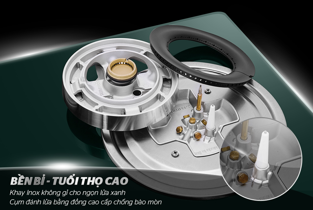 Cụm đánh lửa nhập khẩu từ Tây Ban Nha kết hợp bát chia lửa lớn, được thiết kế với nhiều khe nhỏ giúp ngọn lửa tỏa đều (3 vòng lửa), nấu ăn nhanh, được trang bị cả đầu hâm nên rất tiết kiệm gas. Được làm từ đồng thau chống bào mòn sử dụng lâu dài, đầu đốt sẽ không bị biến dạng dù cho việc sử dụng dưới nhiệt độ cao trong một khoảng thời gian dài khi ninh, hầm,…