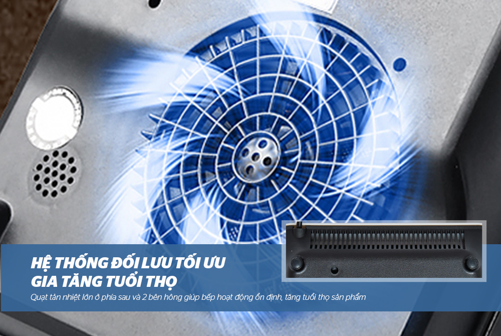 Dù không trực tiếp dùng nhiệt để đun nấu nhưng sản phẩm vẫn trang bị quạt tản nhiệt lớn ở phía sau và 2 quạt bên hông để đảm bảo các linh kiện bên trong luôn được mát, giữ cho mâm từ có nhiệt độ ổn định trong suốt quá trình hoạt độngBảng hiển thị dễ sử dụng.