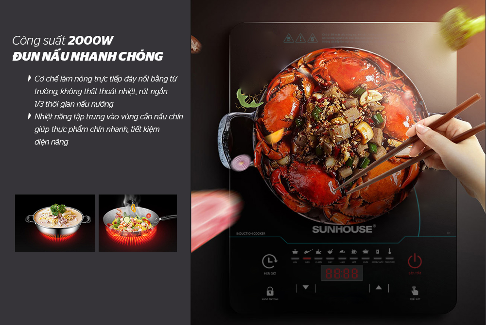 Bếp điện từ SUNHOUSE SHD6863 có mâm nhiệt làm từ đồng nguyên chất cùng với công suất cao 2200W quá trình gia nhiệt diễn ra nhanh hơn. Cơ chế làm nóng trực tiếp đáy nồi bằng từ trường và nhiệt năng chỉ tập trung vào vùng cần nấu chín giúp thực phẩm chín nhanh, rút ngắn thời gian nấu nướng chỉ bằng 1/3.