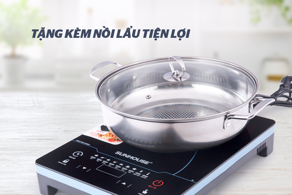 Tặng kèm bếp là một nồi lẩu inox vung kính tiện lợi, đáp ứng tốt nhu cầu cho những bữa tiệc gia đình.