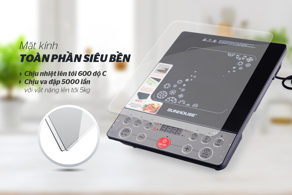 Mặt bếp SUNHOUSE SHD6152 phủ kính toàn phần, dễ dàng làm sạch, chống trầy xước. Đặc biệt, mặt bếp có khả năng chịu được nhiệt độ lên đến 600 độ C, chịu va đập 5000 lần với vật nặng 5kg* - hạn chế nứt vỡ, giúp bạn yên tâm nấu nướng.