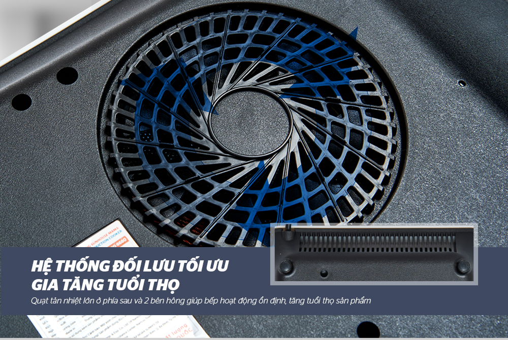 Dù không trực tiếp dùng nhiệt để đun nấu nhưng sản phẩm vẫn trang bị quạt tản nhiệt lớn ở phía sau và 2 quạt bên hông để đảm bảo các linh kiện bên trong luôn được mát, giữ cho mâm từ có nhiệt độ ổn định trong suốt quá trình hoạt độngBảng hiển thị dễ sử dụng.