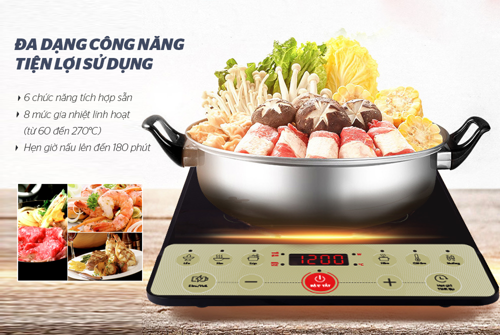 Sản phẩm được tích hợp sẵn 6 chức năng nấu nướng (lẩu, cháo, xào, hầm…) và 8 mức gia nhiệt linh hoạt (từ 60 độ - 270 độc C), cho bạn tùy chỉnh linh hoat theo mong muốn sử dụng.
