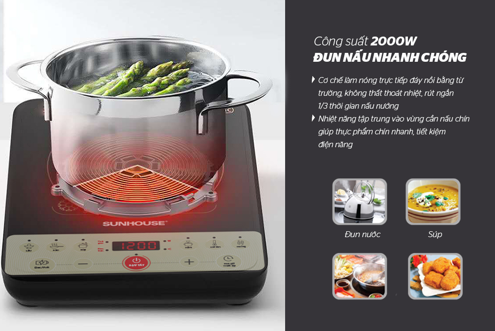 Bếp điện từ cơ SUNHOUSE SHD6152 có mâm nhiệt làm từ đồng nguyên chất cùng với công suất cao 2000W quá trình gia nhiệt diễn ra nhanh hơn. Cơ chế làm nóng trực tiếp đáy nồi bằng từ trường và nhiệt năng chỉ tập trung vào vùng cần nấu chín giúp thực phẩm chín nhanh, rút ngắn thời gian nấu nướng chỉ bằng 1/3.