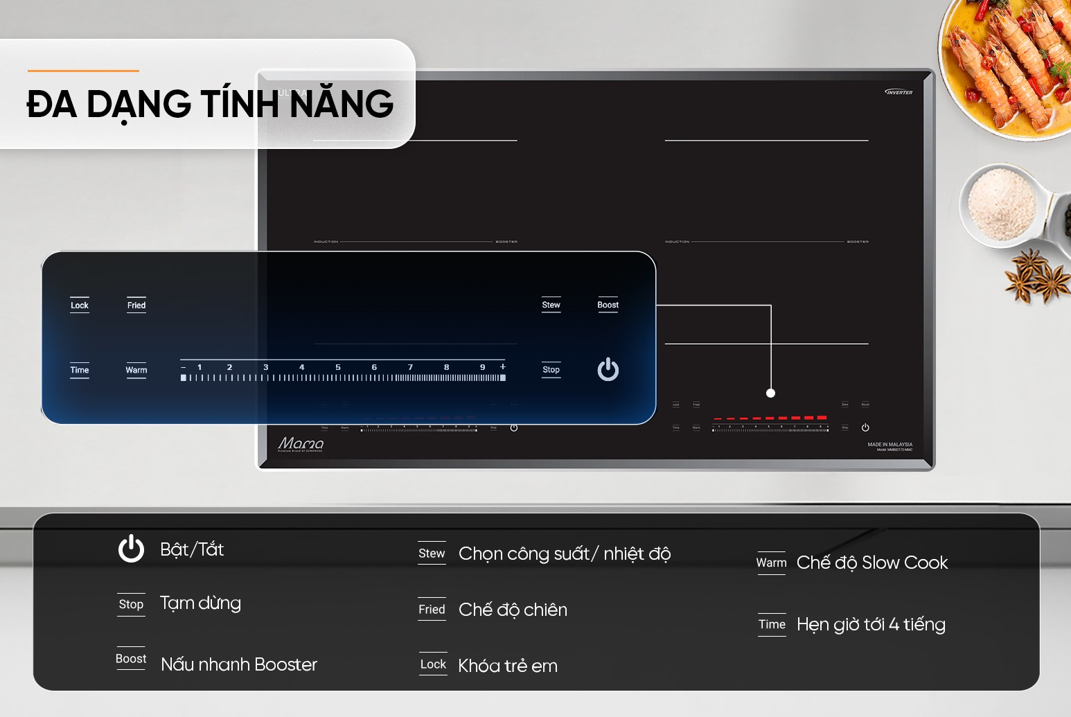 Với 9 mức nhiệt độ khác nhau, người dùng có thể dễ dàng thao tác tùy chỉnh theo nhu cầu nấu nướng. Mỗi vùng nấu đều có bảng điều khiển riêng biệt, tạo nên sự tiện lợi và linh hoạt khi sử dụng, giúp bạn dễ dàng điều chỉnh nhiệt độ cho từng món ăn khác nhau cùng lúc. Đặc biệt, độ nhạy cao của bảng điều khiển giúp việc thay đổi nhiệt độ diễn ra nhanh chóng, chính xác, mang đến trải nghiệm nấu nướng mượt mà.