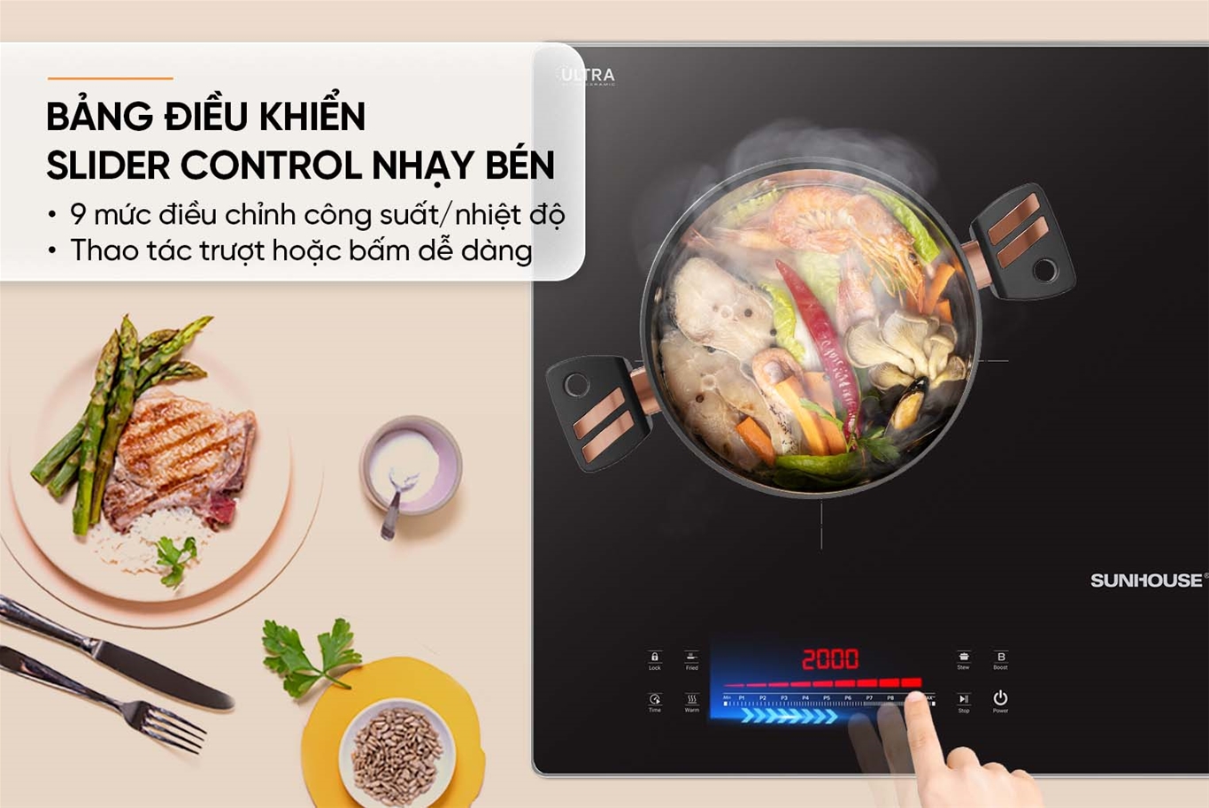 Bếp này trang bị 9 cấp điều chỉnh nhiệt độ/công suất, với 2 bảng điều khiển độc lập cho mỗi khu vực nấu. Bảng điều khiển SLIDER CONTROL có tính cảm ứng cao, cho phép người dùng điều chỉnh nhiệt độ và các chế độ nấu một cách nhanh chóng và tiện lợi chỉ với một thao tác. Người dùng chỉ cần kéo tay trượt sang trái hoặc sang phải để tăng/giảm và điều chỉnh nhiệt độ, công suất hoặc thời gian. Điều khiển trượt cảm ứng dễ sử dụng, phù hợp với mọi người dùng.