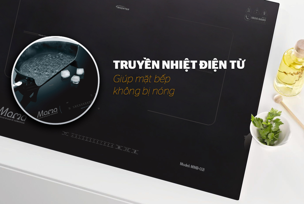 MMB-02I với cơ chế truyền nhiệt điện từ giúp cho mặt bếp không bị nóng, dễ dàng lau chùi ngay cả trong và sau khi nấu nướng. Đồng thời giúp mặt kính bền bỉ, không bị biến dạng do bị ảnh hưởng bởi sự giãn nở nhiệt.