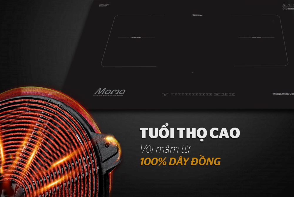 Bếp đôi điện từ SUNHOUSE MAMA MMB-02I với mâm từ được làm bằng 100% dây đồng siêu bền, giúp truyền nhiệt tốt và tăng tuổi thọ của bếp.