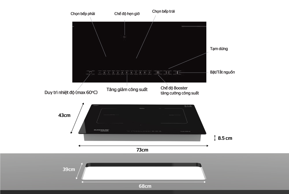Kích thước mặt bếp: 730 x 430 mm