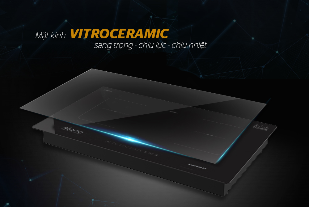MMB-02I sử dụng mặt kính Vitroceramic nguyên khối, tạo cảm giác bền bỉ, chắc chắn. Loại kính này có khả năng chống sốc nhiệt tốt, chịu nhiệt lên đến 600 độ C, khó bị nứt vỡ, trầy xước ở điều kiện nhiệt độ thường. Một ưu điểm nữa của kính Vitroceramic là mặt kính nhẵn, phẳng, dễ dàng vệ sinh lau chùi. Đặc biệt, hệ số dẫn điện của kính Vitroceramic rất thấp nên vùng lân cận của khu vực nấu ăn không bị nóng trong quá trình nấu, bạn hoàn toàn có thể thao tác xung quanh vùng nấu một cách an toàn.