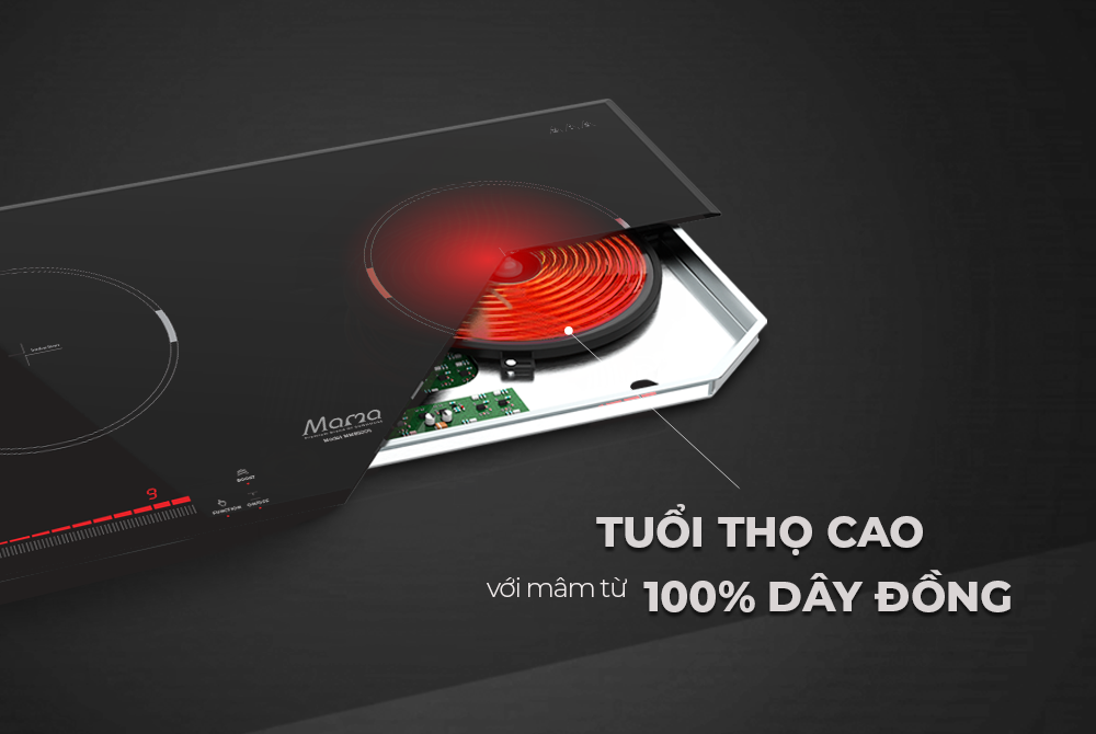 Mâm từ bằng đồng nguyên chất giúp làm nóng nhanh gấp 2 lần bếp thường, cho tuổi thọ bếp bền bỉ.