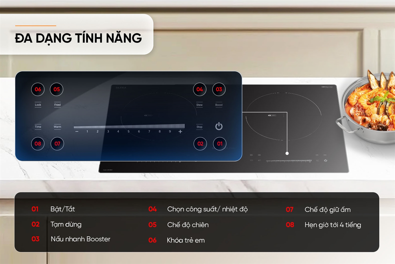 - BOOSTER nấu nhanh chóng, hiệu suất truyền nhiệt tới 90%