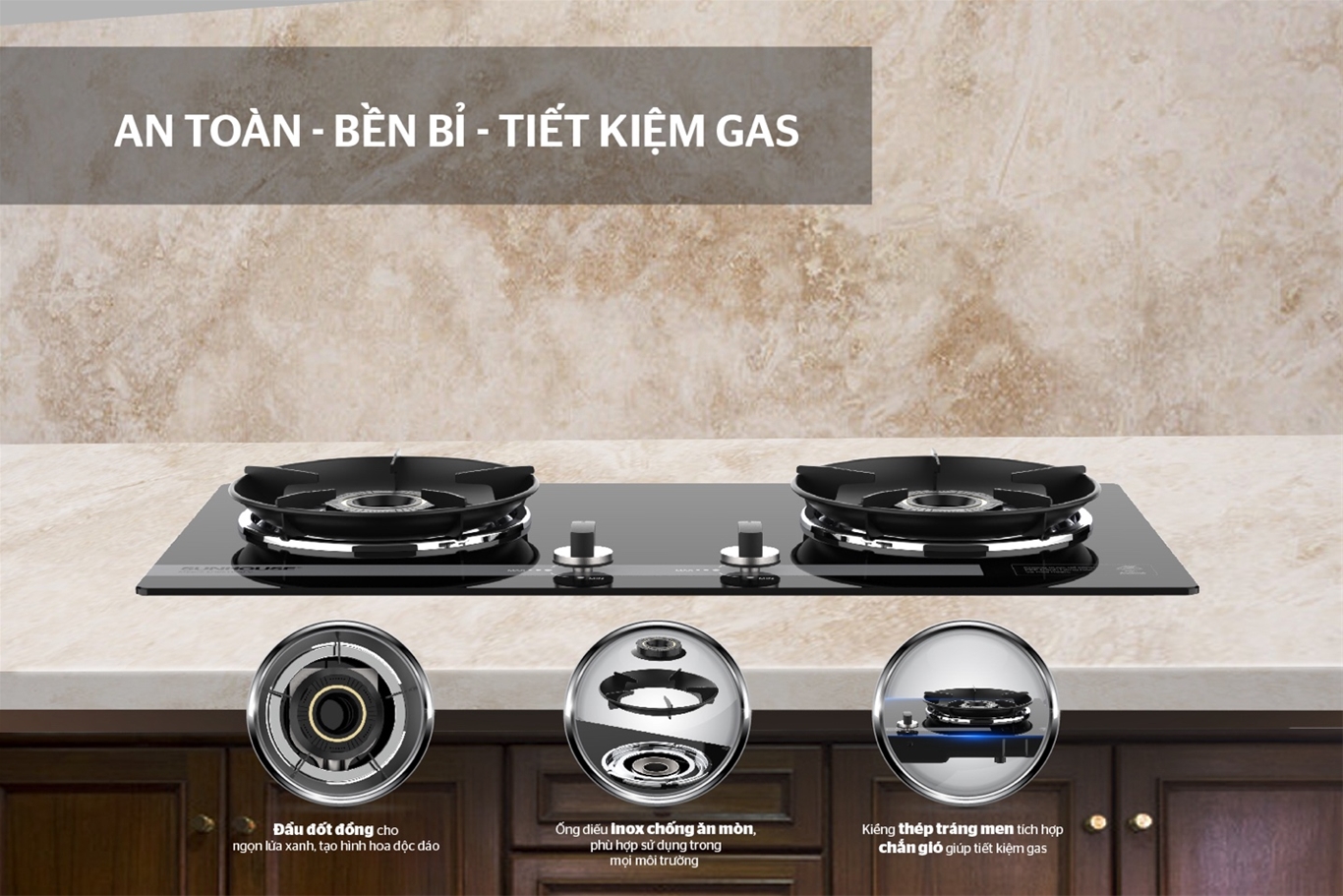 Đầu đốt được thiết kế với nhiều khe nhỏ, bát chia lửa lớn giúp ngọn lửa tỏa đều (2 vòng lửa), nấu ăn nhanh, được trang bị cả đầu hâm nên rất tiết kiệm gas. Do được làm từ hợp kim đồng chống bào mòn nên đầu đốt sẽ không bị biến dạng dù cho việc sử dụng dưới nhiệt độ cao trong một khoảng thời gian dài khi ninh, hầm,…Họng bếp bằng thép không gỉ, không sinh ra muội đen, cho ngọn lửa xanh không đen đáy nồi, tiết kiệm nhiên liệu và an toàn khi sử dụng.
