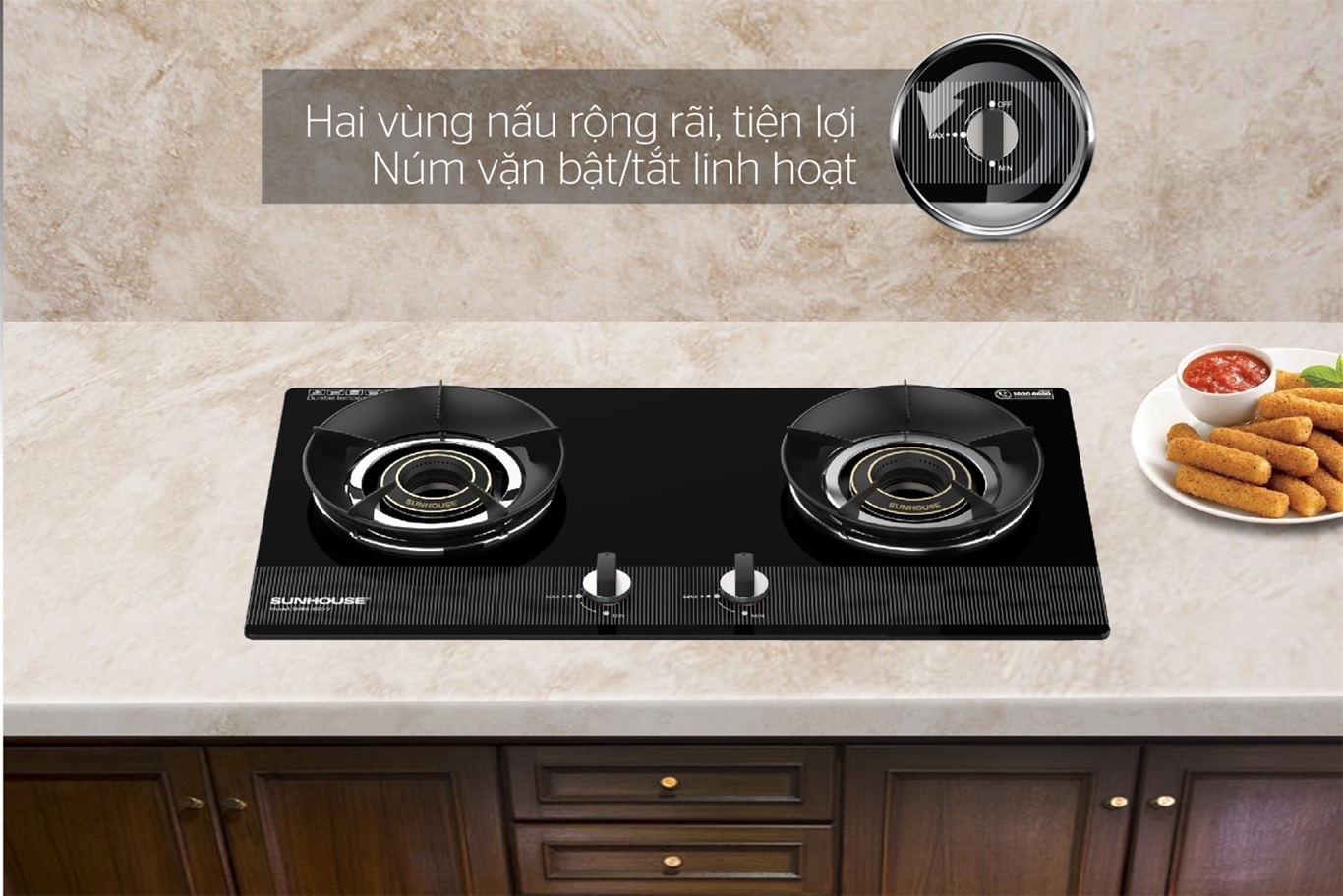 Sản phẩm bếp gas âm kính SUNHOUSE SHB61030-V sử dụng núm vặn để điều khiển, đem lại trải nghiệm dễ dàng và tiện lợi. Với 2 lò đun, người dùng có thể vừa nấu canh, vừa chiên xào thực phẩm một cách thật thoải mái kể cả với các loại nồi chảo lớn.