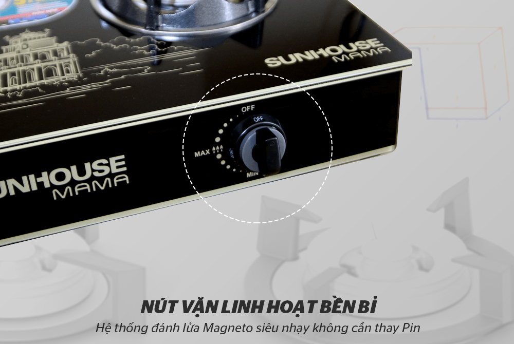 Bếp gas dương kính SUNHOUSE MAMA MMBB0787B sử dụng hệ thống đánh lửa Magneto (còn được gọi là hệ thống đánh lửa cơ), hoạt động dựa trên nguyên lí sử dụng 2 đá lửa đập vào nhau tạo ra ngọn lửa đều và xanh. Hệ thống đánh lửa Magneto điều khiển bằng núm vặn linh hoạt, bền bỉ, ít hỏng hóc, không cần thay pin như ở hệ thống IC.