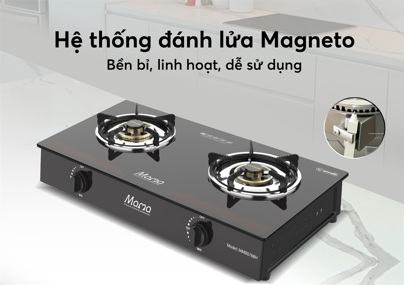 Bếp gas dương kính SUNHOUSE MMB0788H sử dụng hệ thống đánh lửa Magneto, hoạt động dựa trên nguyên lý sử dụng bằng cách xuất hiện ra tia lửa điện, làm tia lửa phát ra kết hợp với khí gas tạo ra phản ứng cháy. Hệ thống đánh lửa Magneto điều khiển bằng núm vặn linh hoạt, bền bỉ, ít hỏng hóc, không cần thay pin như ở hệ thống IC.