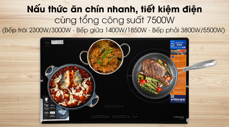 Công suất vùng nấu: Trái: 2300/3000W - Phải: 3800/5500W - Giữa: 1400/1850W