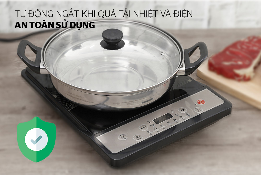 Bếp trang bị thiết bị bảo vệ khi dòng điện bị quá tải. Khi nồi quá nóng, bếp sẽ tự động tắt, còi báo. Bạn chỉ cần chờ vài phút để bếp nguội sau đó bật bếp lên và sử dụng bình thường.