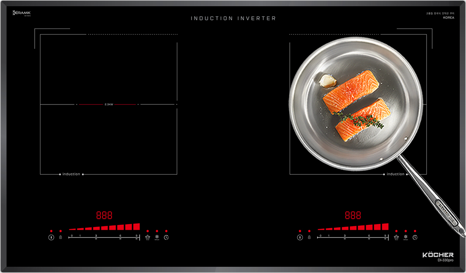 Đây một trong số rất ít bếp từ có thể đạt Booster lên đến 2300W. Với thiết kế của bếp từ Kocher DI-330Pro cả 2 vùng nấu có khả năng kích công suất Booster cực đại lần lượt là 2300W | 2300W giúp công việc đun nấu trở nên nhanh chóng và tiết kiệm thời gian khi cần thiết.