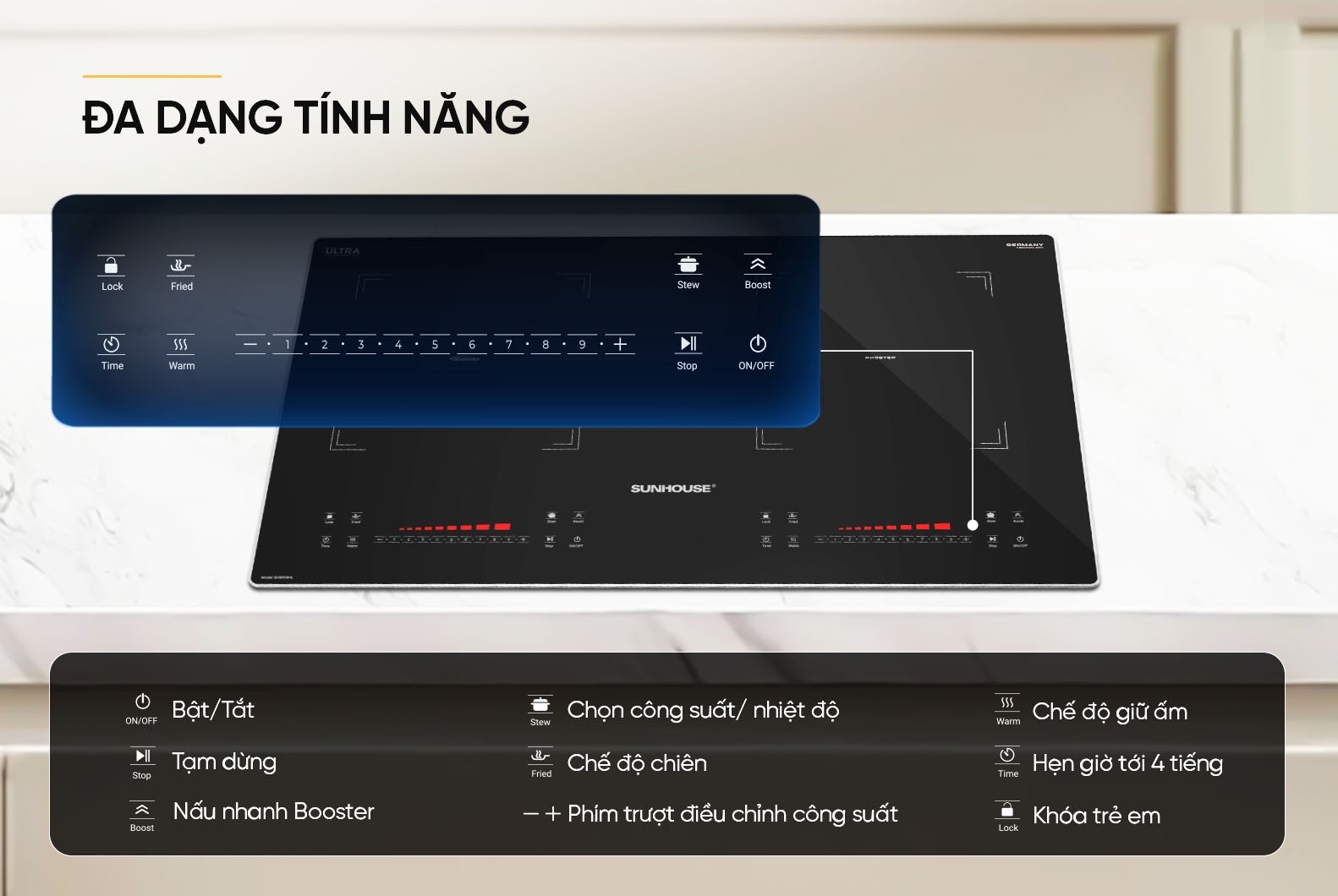 Bếp đôi điện từ Sunhouse SHB568HL tích hợp nhiều tính năng an toàn hiện đại như: khóa trẻ em, hẹn giờ đến 4 tiếng, chức năng tạm dừng tiện lợi và tự động ngắt khi quá nhiệt hoặc không có nồi. Các tính năng này không chỉ giúp người dùng an tâm khi sử dụng mà còn góp phần bảo vệ thiết bị, nâng cao độ bền và hiệu quả nấu nướng.