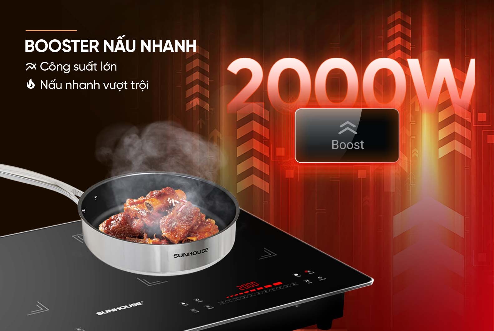 Bếp đôi điện từ Sunhouse SHB568HL tích hợp chức năng Booster, cho phép đẩy công suất lên mức 2000W cực đại chỉ trong vài giây. Chức năng này giúp gia nhiệt nhanh chóng, lý tưởng để đun sôi nước, nấu canh, luộc rau hoặc chiên xào, đặc biệt hữu ích khi thời gian nấu nướng hạn hẹp. Nhờ vậy, bếp giúp tiết kiệm thời gian nấu và giảm lượng điện năng tiêu thụ đáng kể.