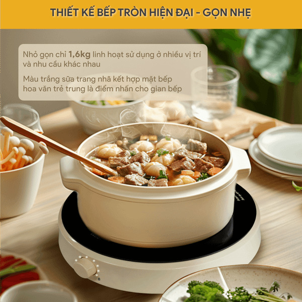 - Thiết kế bếp từ tròn mang lại sự tiện lợi và trang nhã, đồng thời tiết kiệm diện tích trong không gian nhà bếp.