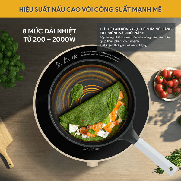 - Bếp từ với công suất cao lên đến 2000W và 8 mức công suất đa dạng đem lại hiệu suất nấu nướng cao và tiết kiệm thời gian.
