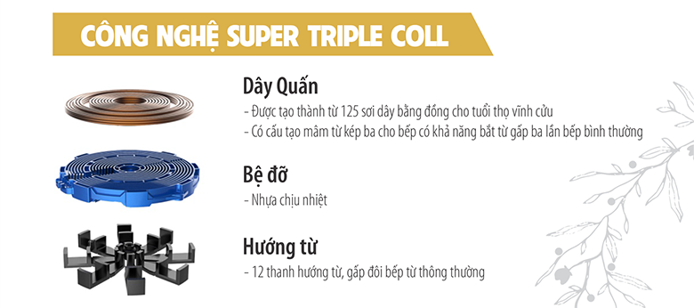 Bếp Elmich ICE-1833 sử dụng mâm từ kép ba được làm từ đồng nguyên chất, cho khả năng bắt từ hiệu quả gấp 3 lần bếp từ thông thường. Công nghệ Super Triple Coll tăng 3 lần hiệu suất bắt từ được tích hợp từ dây cuốn, bệ đỡ, hướng từ cho tuổi thọ vĩnh cửu, tiết kiệm đến 70% năng lượng. Nhờ đó, bếp có thể đạt công suất 2100W, giúp đun nấu nhanh, tiết kiệm thời gian nấu.