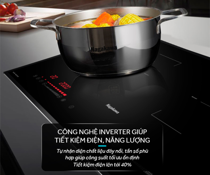 Công nghệ này giúp bếp từ điều chỉnh mức công suất phù hợp để không làm tiêu thụ nhiều điện năng. Bếp từ inverter có cảm biến thông minh sẽ cố định công suất tiêu thụ điện khi đun nấu và tự động điều chỉnh liên tục để đảm bảo mức nhiệt tương đương bằng với con số hiển thị trên bàn điều khiển.