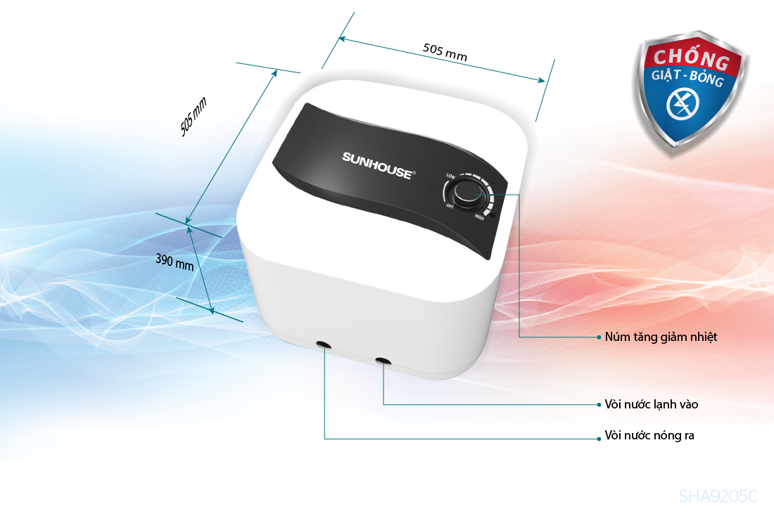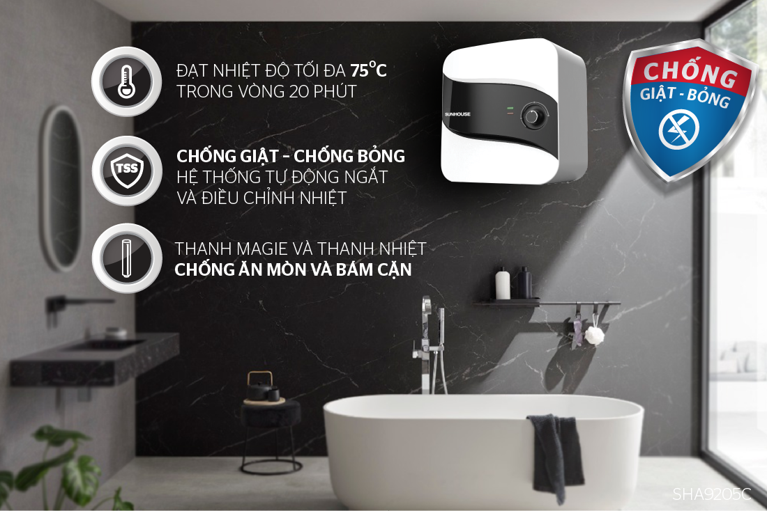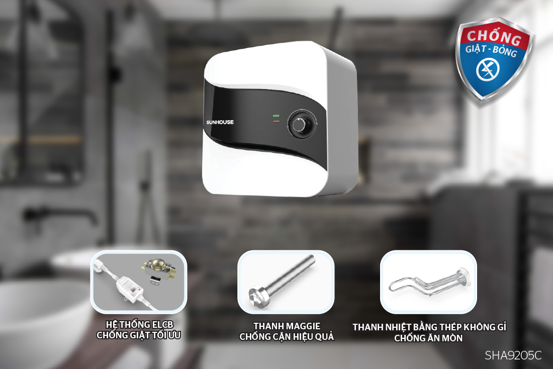 Bình nước nóng SUNHOUSE tích hợp hệ thống an toàn đồng bộ với ELCB và bộ ổn định nhiệt điện tử, CHỐNG GIẬT – CHỐNG BỎNG cho người sử dụng.