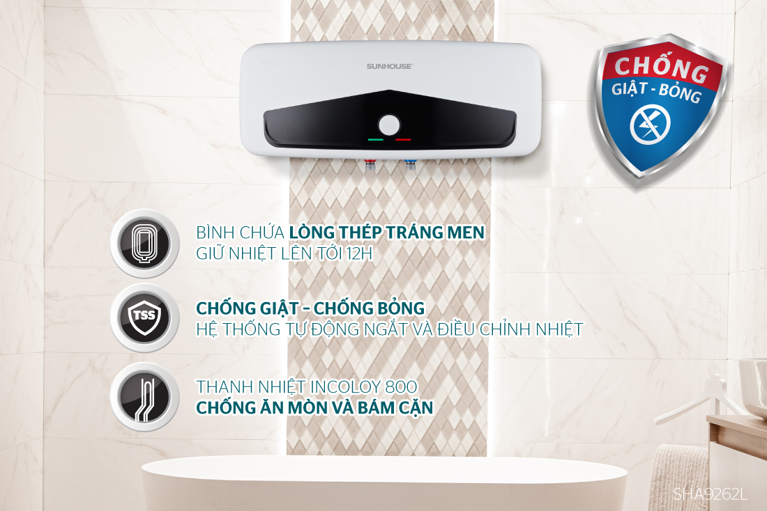 Bình nước nóng SUNHOUSE tích hợp hệ thống an toàn đồng bộ với ELCB và rơ le kép chống quá nhiệt, đem đến hiệu quả CHỐNG GIẬT – CHỐNG BỎNG cho người sử dụng.