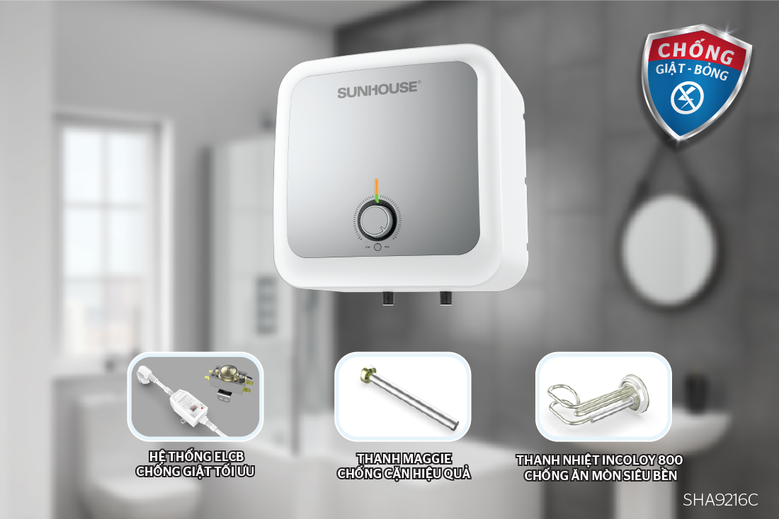 Bình nước nóng SUNHOUSE tích hợp hệ thống an toàn đồng bộ với ELCB và bộ ổn định nhiệt điện tử, CHỐNG GIẬT – CHỐNG BỎNG cho người sử dụng.