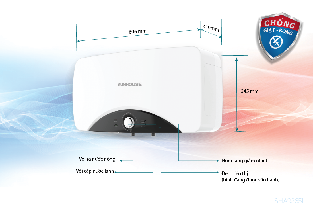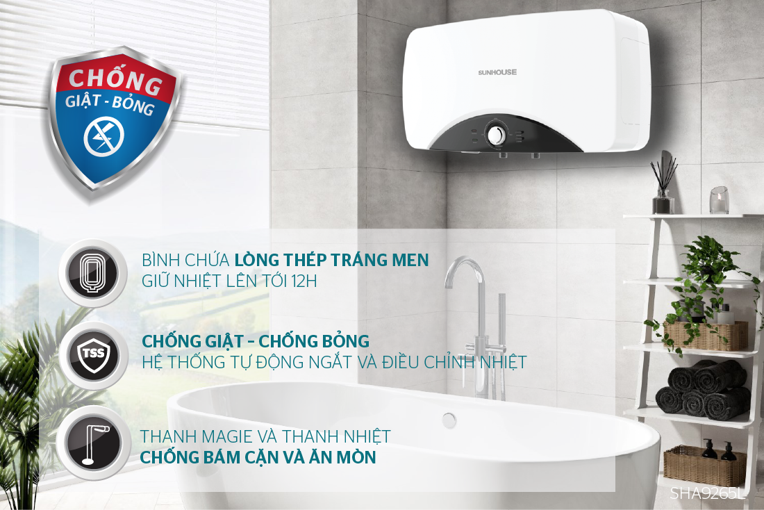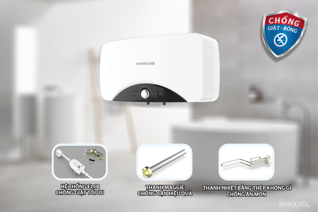 Bình nước nóng SUNHOUSE tích hợp hệ thống an toàn đồng bộ với ELCB và bộ ổn định nhiệt điện tử, CHỐNG GIẬT – CHỐNG BỎNG cho người sử dụng.