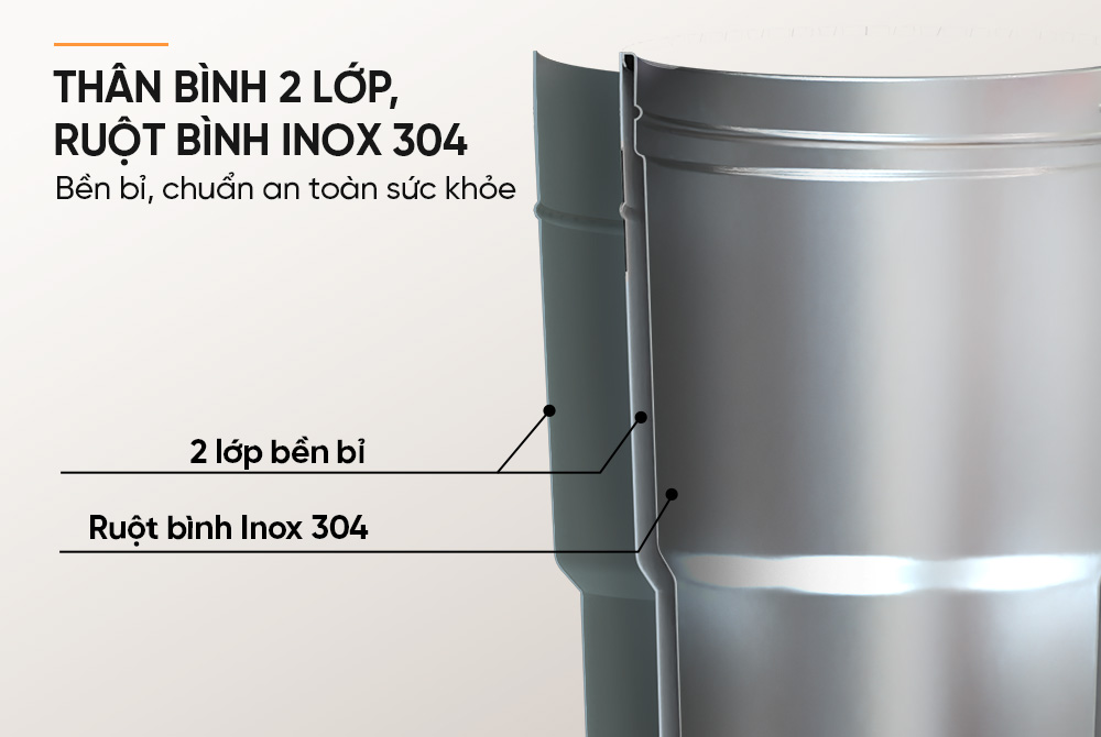Thân bình 2 lớp giữ nhiệt hiệu quả, ruột bình INOX 316 - An toàn tuyệt đối cho sức khỏe