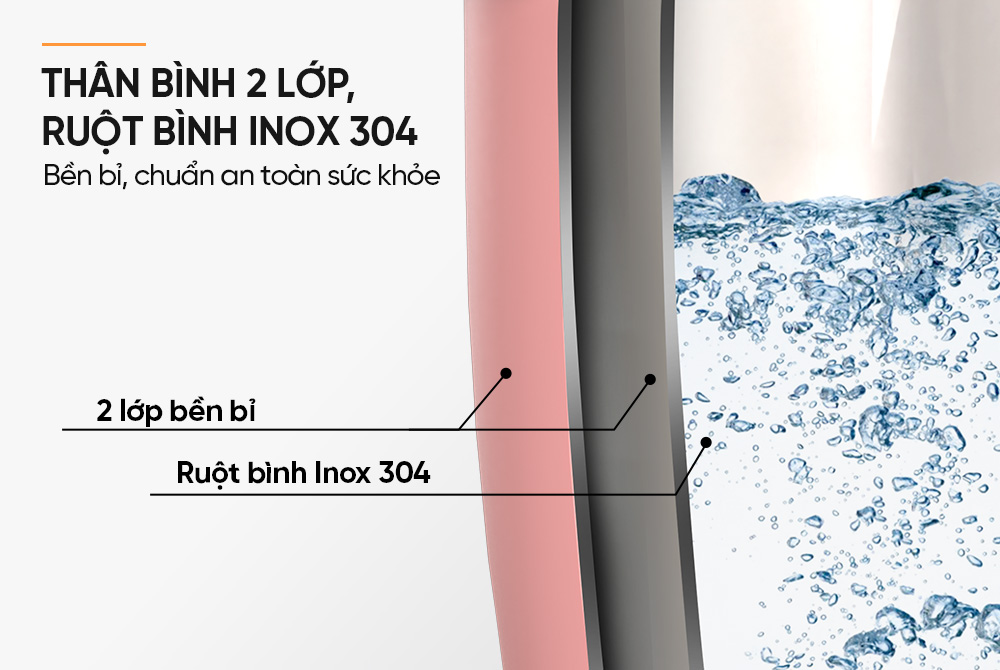 Thân bình 2 lớp giữ nhiệt hiệu quả, ruột bình INOX 304 bền bỉ