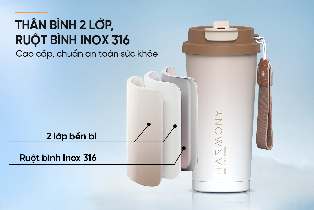 Lõi bình làm từ INOX 316 cao cấp, bền chắc và an toàn cho sức khỏe, không phản ứng với đồ uống nóng lạnh. Thân bình 2 lớp giúp duy trì nhiệt độ ổn định lâu hơn.