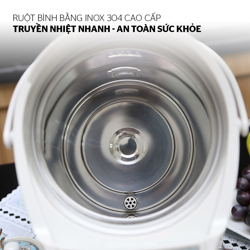 Bình thủy điện có kết cấu 2 lớp với ruột bình làm từ inox SUS304 (thép không gỉ) cao cấp. Chất liệu này dẫn nhiệt nhanh, đun sôi nước trong thời gian ngắn nhưng không bị oxy hóa, không bám cặn sau khi sử dụng một thời gian dài.