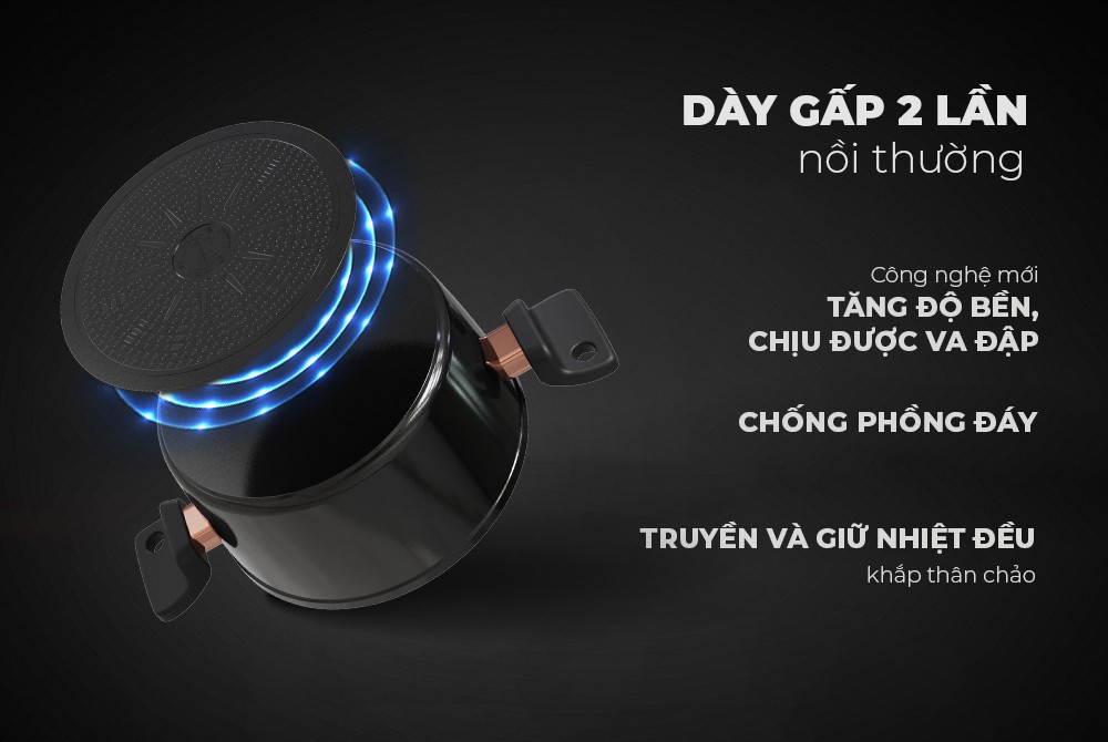 Lõi nồi từ nhôm cao cấp cùng thiết kế đáy dày gấp 2 lần các sản phẩm nhôm thông thường giúp cho nồi có khả năng chống va đạp cực tốt, đồng thời chống phồng đấy trong thời gian dài nấu nướng ở nhiệt độ cao. Thiết kế lõi nhôm giúp truyền nhiệt nhanh và đều, tiết kiệm thời gian và nhiên liệu trong quá trình nấu nướng.